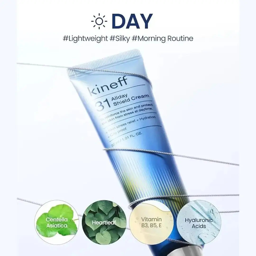 Una crema de día (All-Day Shield Cream) que protege tu piel del sol, polvo y contaminación, al mismo tiempo que mantiene una hidratación ligera y duradera durante todo el día.